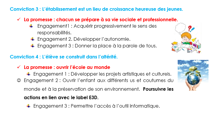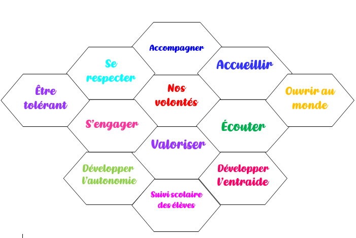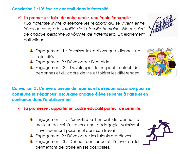 Notre communauté éducative s’engage à respecter et à vivre les valeurs de tolérance, d’entraide et de respect des différences. L’équipe éducative souhaite créer une ambiance de travail propice au développement de l’élève, en l’accompagnant pour le mieux, en l’aidant à grandir dans l’estime de soi, à s’engager dans des actes, et à s’ouvrir aux autres.